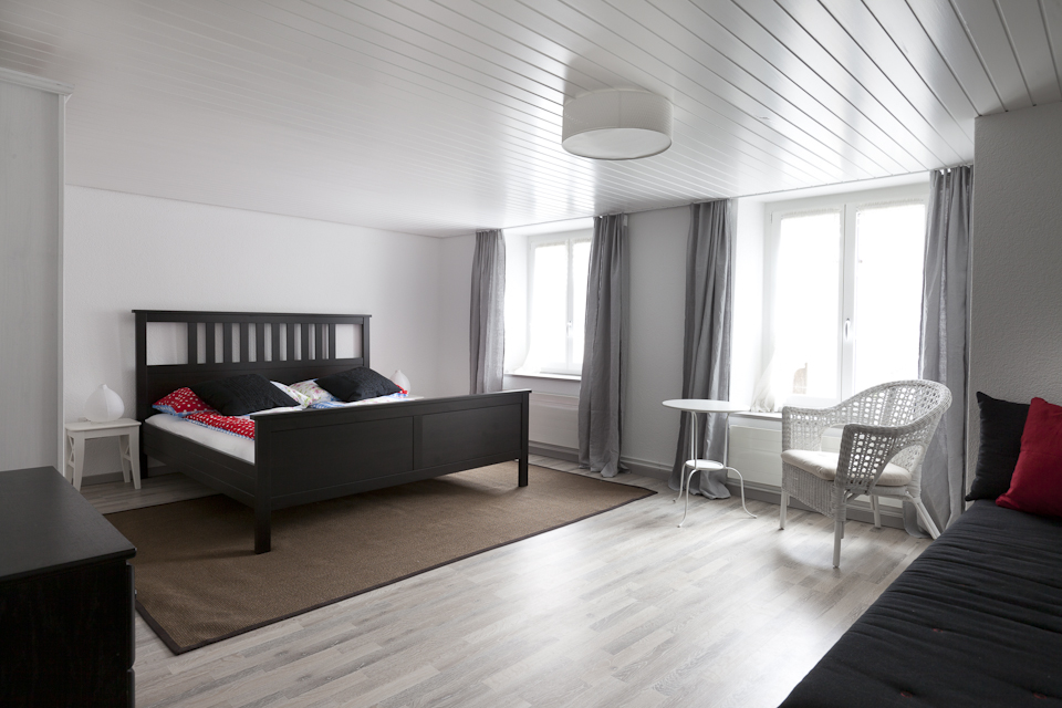 Es ist unser grösstes Zimmer! Ideal für Familien. Ein geräumiges Zimmer mit Doppelbett, eine Sitzecke mit TV und Gratis-WiFi. Auf Wunsch kann diese auch für weitere zwei Schlafplätze genutzt werden. Der Blick aus dem Zimmer führt ins Dorf und direkt auf das Schulhaus mit seinem «Glockentürmli». Bad/Dusche/WC befinden sich auf der Etage. Im angrenzenden Morgen-Stübli gibt es eine voll ausgestatte Küche, Kaffee und Tee sowie ein Frühstück (Selfservice) für den Start in den Tag.